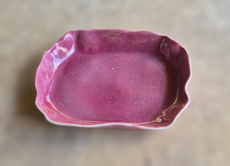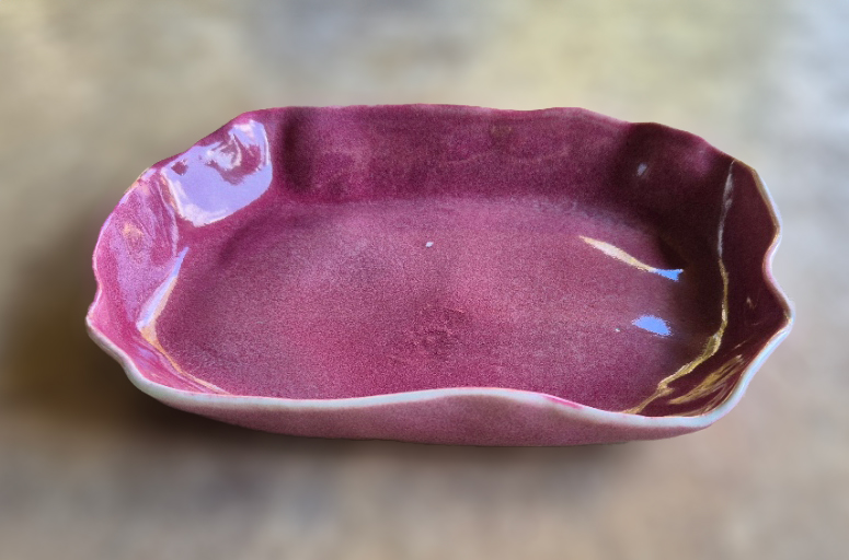 Bandeja de porcellana rectangular con bordes ondulados y esmalte magenta brillante con matices satinados. El borde claro realza su diseño orgánico. Ideal para presentar frutas, dulces o aperitivos. Esta pieza convierte tu mesa en un espacio donde la funcionalidad se funde con la creatividad.