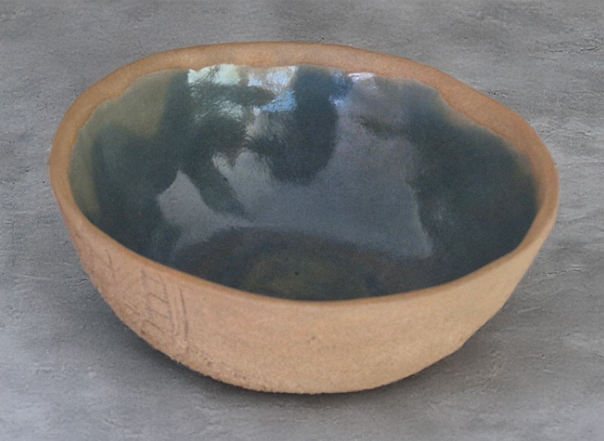Interior esmaltado en azul profundo, brillante y sereno, que contrasta con la base rústica.
