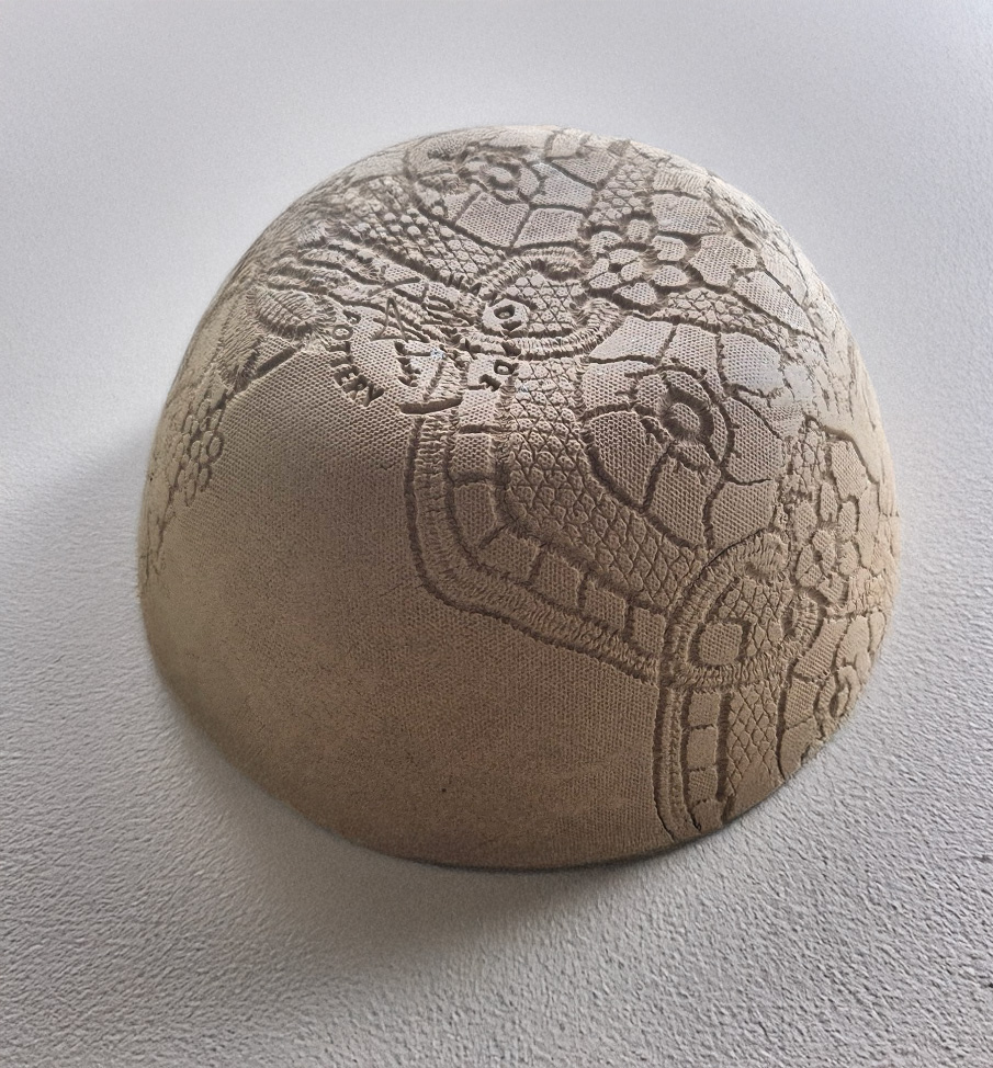 Bol de gres con exterior en tonos tierra y textura de encaje grabado en relieve.